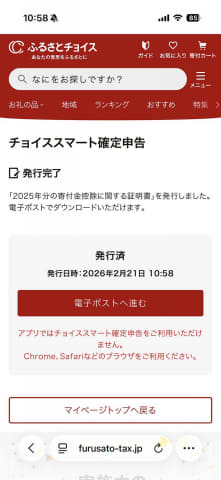 筆者はふるさと納税ポータルとして「ふるさとチョイス」を使っており、寄付金控除に関する証明書を発行する「チョイススマート確定申告」の発行が必要です。といっても、ログインしてチョイススマート確定申告の発行申し込みをするだけで、すぐにマイナポータルからデータ取得が行なえました。