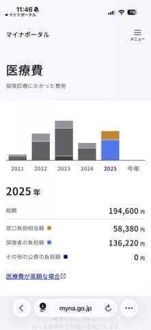 しかし、マイナポータル連携が済んでいれば、1年間の医療費がマイナポータル上ですぐに確認できるため、自分が医療費控除の対象かどうかがすぐにわかります。今年の筆者の「医療費」を見ると、2025年の窓口負担相当額は5.8万円。10万円以下なので申告の必要はないことがすぐにわかります。