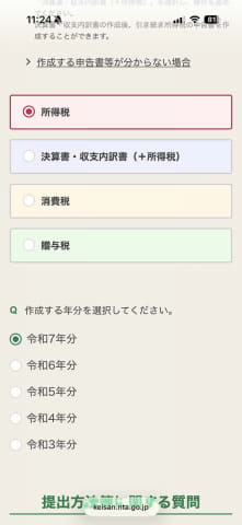 【確定申告書等作成コーナー】から作成開始をタップすると、作成のステップが示され、「次へ」を押すと、作成する申告書や申告書の提出方法の確認となります。筆者の場合、作成する申告書は「所得税」でマイナンバーカードを使った申請を選び、マイナポータルを「利用する」などを選択しました。