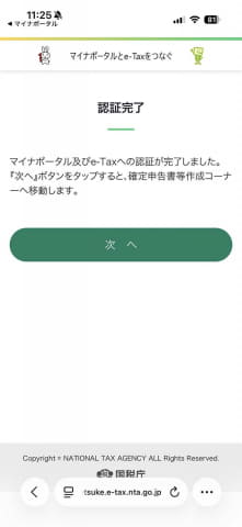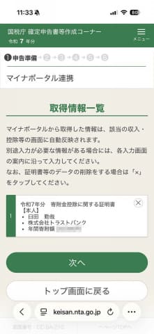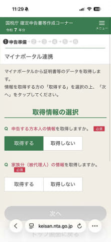 ここで、マイナポータルから取得可能な控除証明書等の一覧が表示され、必要な証明書だけをチェックして「次へ」をタップすると、確定申告コーナーの緑の画面に戻ります。マイナポータル連携で、いろいろなデータが取得できますが、筆者の場合は年末調整済みで今年必要なのは、ふるさと納税だけ。ふるさと納税だけ選んで進みました。