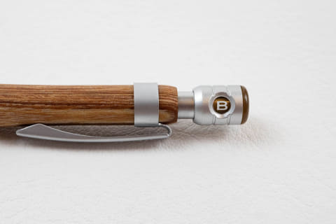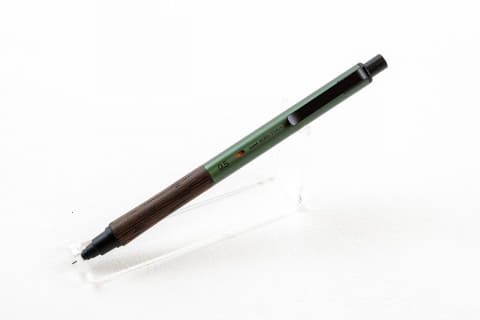 「木目にこだわった木製グリップとブラスト処理を施したアルミ製後軸を組み合わせることで、異素材が調和した上質さと天然木ならではの温もりを感じられる1本です。芯が常に尖り続けるので、軸を回してとがっているところに調整する必要がなく、書くことに集中できます。カラーは定番の黒ではなく、フォレストグリーンとスチールグレーの2色展開で、黒以外が欲しい、軸色で個性を出したい、という方にもおすすめです」