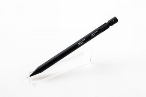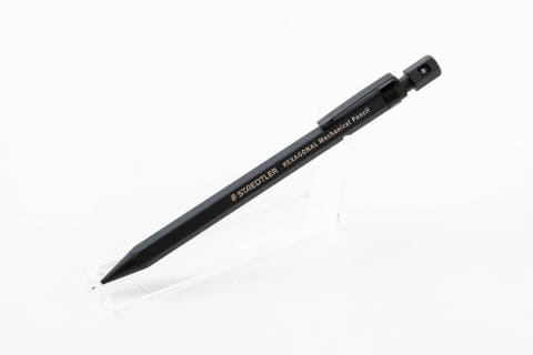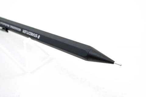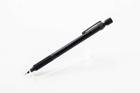 「もう1本の『オールブラックシャープペンシル』はステッドラーの日本法人が商品企画をしてつくったもの。元々はシルバーだった躯体を流行のブラックにアレンジし、パーツ類やロゴまですべてをブラックで統一した商品になります。長く製図用品を扱ってきたドイツメーカーということで、ブランドへの信頼も厚く、幅広く支持されています」