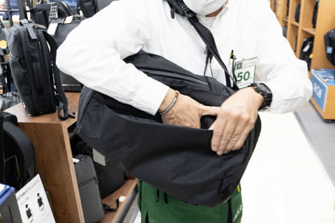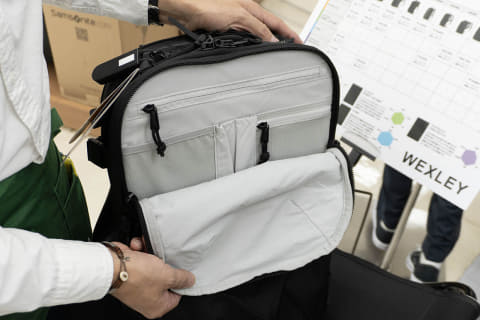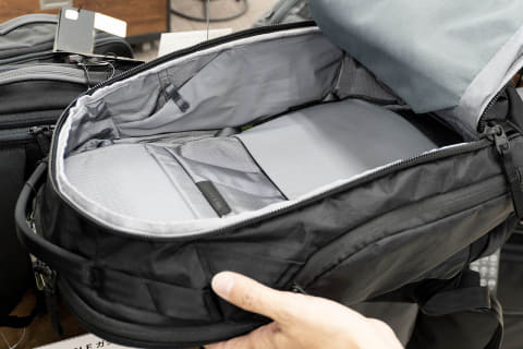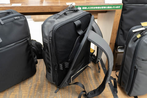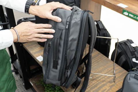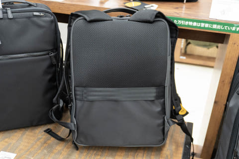「さらに、ここ1~2年で増えているのが荷物の重量感を軽減する機能を搭載したモデルです。もちろん、バッグ自体が軽量なものもありますが、軽量化にも限界があるため、より肩や腰に負担がかからないような構造を採用したリュックが増えています。PC、タブレット、書類と重たいものを持ち運ぶ方は、こういったモデルを店舗で試していただければと思います」