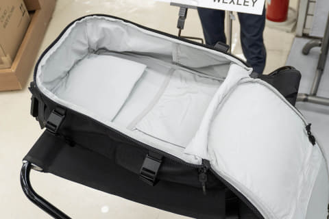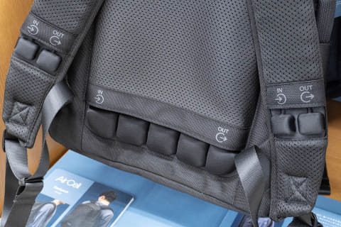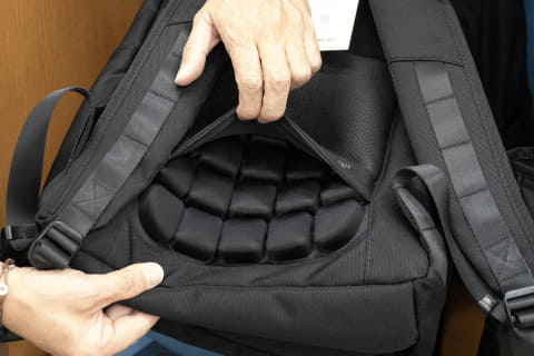 「ストラップと背中の部分にエアパッキンのようなものが入っていて、ここに入れる空気の圧力を自分の身体に合わせて調整できるのが一番のポイントになります。クッションの硬さは人により好みが異なりますが、そこを調整できるリュックは今までありませんでした。さらに、空気を入れるセルの隙間が空気の通り道になるので通気性が良く、背中に熱がこもりにくいのもメリット。夏の暑さ対策にも役立ちます」