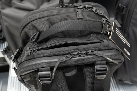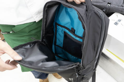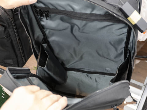 「背中側に独立したノートPC用のポケットがあり、メイン収納はフルオープンになるのも特徴です。前面の生地はX-Pacですがボディにはコーデュラナイロンを使用しているため、つくりはかなりしっかりしていて型崩れを防いでくれます。大事なものにもすぐ手が届くようにポケットを配置していたり、電車の網棚にのせる時などに便利なサイドハンドルがついていたりと機能面にも隙がありません」
