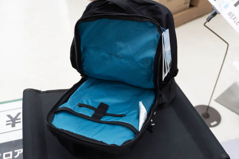 サイズは32×44×16cm(幅×高さ×奥行)、価格は20,900円。「実際、2リットルのペットボトルを入れて背負ってみると違いがわかる」と中山さん。非常にシンプルなつくりながらメイン収納には14型ノートPCが入るポケットがあるなど、ビジネス対応の機能性も兼ね備えています。