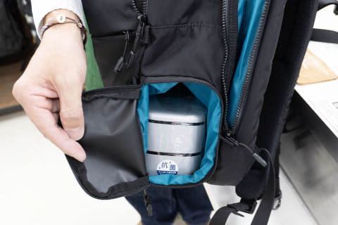 「小ぶりのリュックが好みの方におすすめのモデルです。特徴的なのは、側面から底の部分の部屋にアクセスできるところ。U字のジッパーを開くと直接アクセスできるこの部屋は、メイン収納とは分かれているためお弁当を入れるのに最適です。そのほか、ジムや旅行で出た汚れ物など、他の荷物に触れさせたくないものを入れることができます」