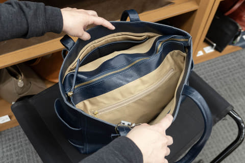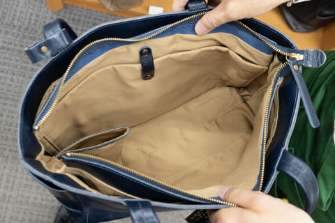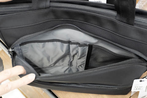 「基本的に革製のトートはすっきりとしたデザインのものが多いのですが、これは中身が見えないようにファスナーが付いているタイプ。メイン収納の両サイドにはオープンスペースがあり、サッと出し入れしたい物の収納に便利です。内側は簡易的ですがペットボトルホルダーやノートPCを収納できるクッション付きのポケットも装備。本体サイドのスマートフォンポケット、名刺やペンケースなどが入れられる多目的ポケットなど収納も充実。オールレザーとしては軽いのも魅力です」