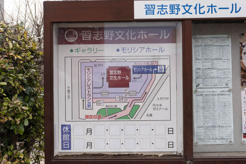 そんなモリシアも、よく見れば明かりがないことがわかりますが、遠目のぱっと見では営業しているようにも感じます。歩行者デッキをモリシアに向かって歩いていくと途中に掲示板があり、施設内にあった習志野文化ホールの休館日欄は空白になっていました。