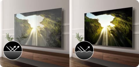 加えて、バックライトの光を量子ドットで変換し、純度の高い色を実現する「広色域量子ドット」により、特に緑と赤の色表現が大幅に改善。「低反射広視野角パネルPRO」では、低反射フィルムで外光の反射を抑え、明るい部屋でも、映り込みの少ない画面を表示する。
