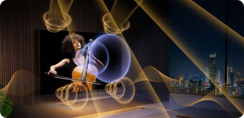 加えて、注目したいのはサウンド。大画面の大迫力とともに必要な音響については、最大出力60Wのスピーカーを搭載し、2.1.2チャンネルの「空間サラウンドシステム」は、左右のスピーカーに上向きのトップスピーカー、中央のサブウーファーからなる構成で、天井からも音が降ってくるような3D音響を実現する。Dolby Atmosにも対応するほか、視聴環境に合わせて最適な音響に自動設定する「オーディオキャリブレーション」などの機能も搭載している。