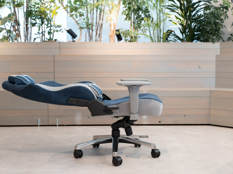 ワークチェアとしても意外に大事なのはリクライニング機構です。このモデルは直立状態からフルフラットまでリクライニングが可能で、”横になっている”という感覚が味わえました。この寝心地、飛行機だったら相当高い料金を取られます。