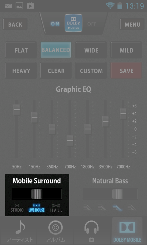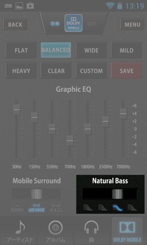 そこで、どんな機種でも安定した音質が提供されているヘッドフォン端子を対象に、ドルビーモバイルの機能が抜き出されている。7バンドのグラフィックイコライザー、拡がりのある音を楽しめるモバイルサラウンド、それに低域の量感を高めるナチュラルベースだ。