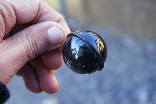 | 本体自体はただのボールで、シャッターボタンのみ | 中にはボタン電池と基板がある | ストラップがあるため、端末にセットしたり、カバンに引っかけたりも容易 |