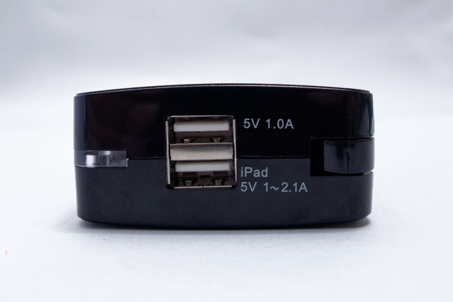 | USBポート×2で、上段は5V/1A、下段は5V/2.1A。またポートの間にある金具はやや外れやすい感じなのだが、もしそうなっても上海問屋愛用戦士諸君ならば対処は余裕だろう | 合計3.1AなのでiPhone 5sとiPad mini(もしくはiPad Air)の同時充電が可能。簡易的だが、5時間連続充電を確認済みだ |