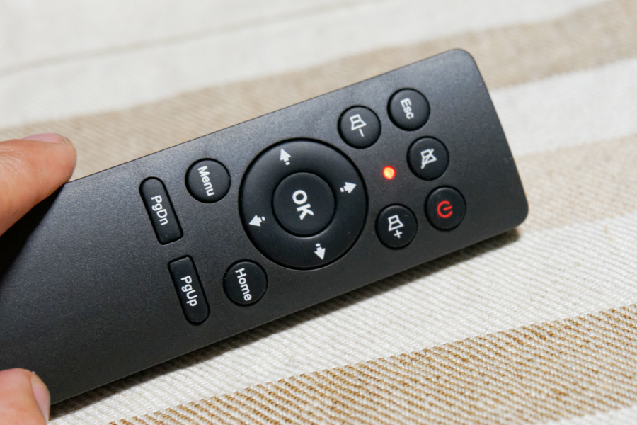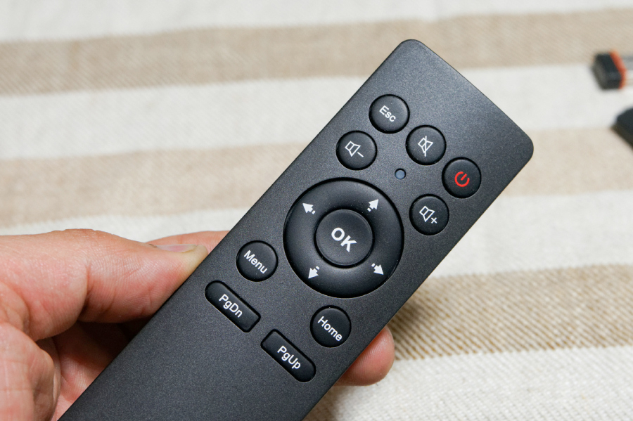 エアーマウスの電源オフ、ESC、ミュート、ボリュームアップ/ダウン、矢印キー、OK(左クリック)、Menu、Home、PgDn、PgUpがある。そのうち、WindowsやMac OS Xで使用できないのはMenuボタンのみ。Menuボタンは、ネットワークメディアプレーヤー DN-10074など、対応する製品で機能する。