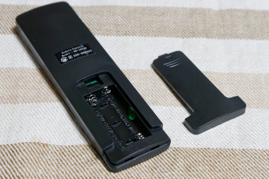 | リモコン的なレイアウト。ボタンもしっかりしている | 電源は単4形乾電池×2。またレシーバーは電源ボックスに入れられた状態で販売されている |