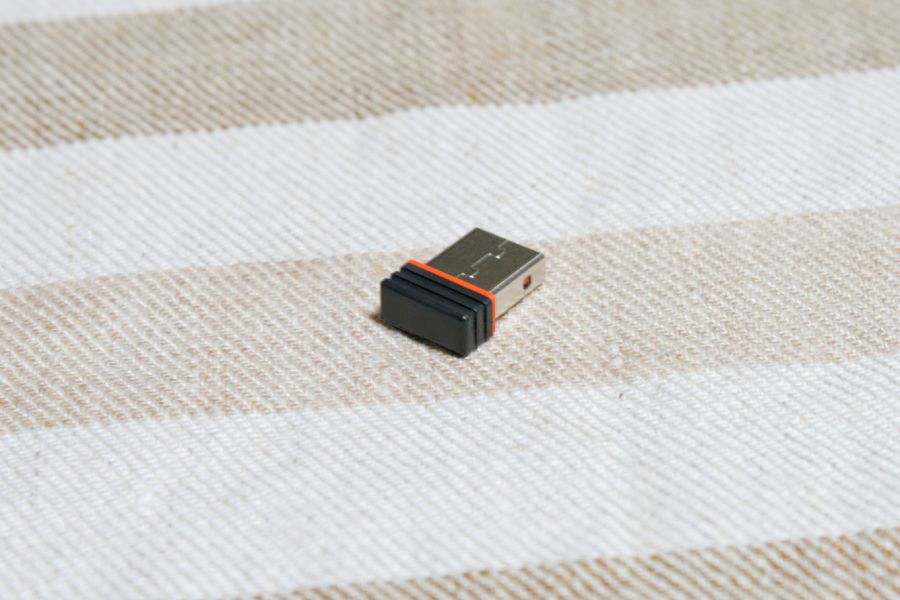 この「エアーマウス DN-10725」はリモコン形状で、2.4GHzワイヤレス接続のマウスだ。動かすとそれに従ってマウスカーソルが動作したり、ハードウェアキーからの入力で特定の動作をする。40mm×140mm×15mmで、重量は電池を含まずで約40g。電源は単4形乾電池×2になる。単4形乾電池は1本12〜15gからすると70gあたりの重量になり、片手でダラダラ操作するには問題のない重量とだといえるだろう。