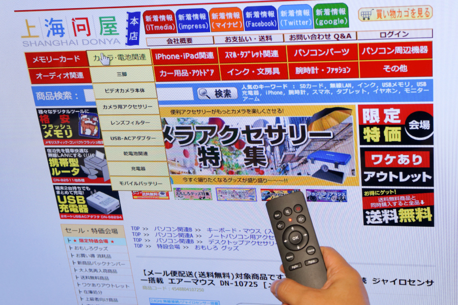リモコン形状で、空中操作でマウスカーソルを動かしたり、カーソル移動ができる空中マウスだ。実売価格は税込み2,999円。