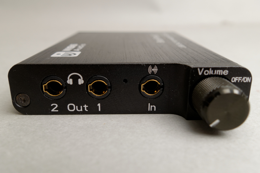 | 本体正面。MIC OUT×2、AUX IN×1、ボリュームがある。電源はボリュームを上げるとオンになる仕様 | 本体背面。AUX-INとDACの切り替えスイッチとmicroUSB端子がある。microUSB端子は充電も兼ねている |