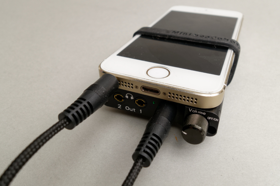 まず、ヘッドフォンアンプとして使用する場合は、背面にあるスイッチを「Aux-in」に切り替えて正面にあるInにスマホからのインプットを行なう。