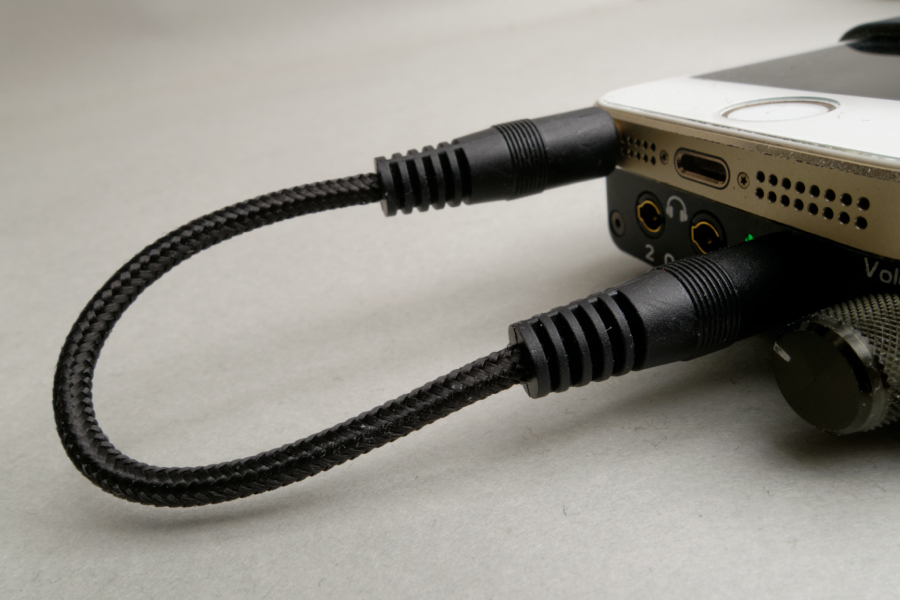 | iPhone 5sにセットしてみたところ | 付属のステレオケーブルの被膜は布製で柔軟性アリ |