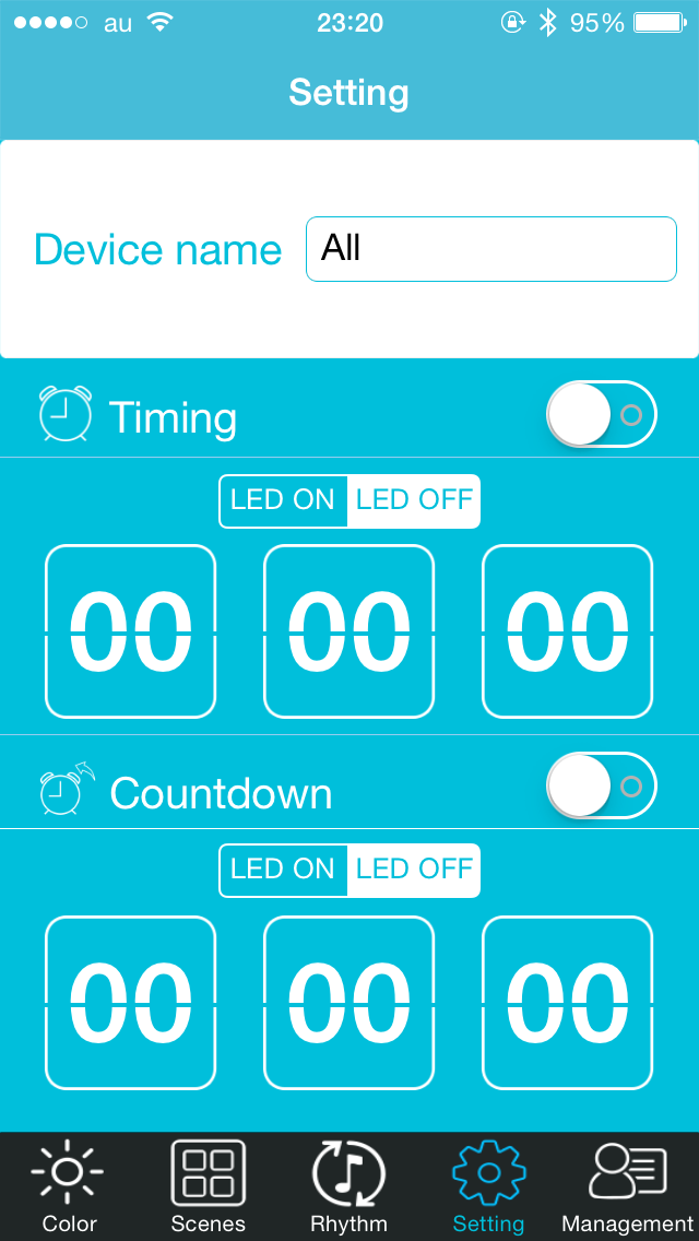 このあたりから、DN-11043の特長が出てくる。本製品はBluetooh 4.0に対応しており、iOSデバイスからのリモート操作が可能。対応する機能は、調光と調色が主で、副次機能として接続中のiOSデバイスのマイクが拾った音に応じて色を変更したり、カウントダウン、特定タイミングで点灯するといった機能もある。