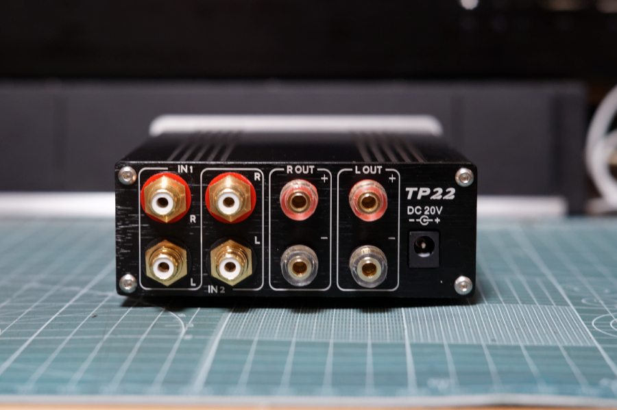 出力などのスペックを見てみると、デジタルアンプにはTripath TK2050を搭載し、30W×2(4Ω)、25W×2(8Ω)。ダイナミックレンジは100dBとなっている。インターフェイスには、RCA入力×2、バナナプラグ対応スピーカーアウトがあり、フロントで入力系統の切替が可能だ。また、操作感として意外と重要なボリュームもアルミ製で豪華さがある。強いて言えば、つまみの重さが少し軽い、と感じるぐらいだろうか。