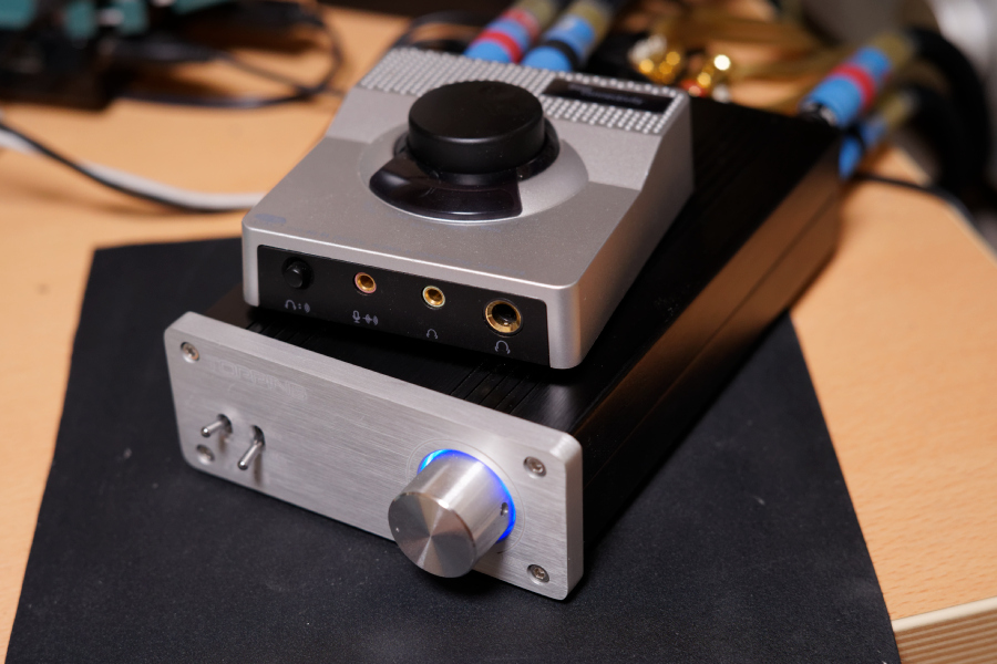 | 電源オン時にはボリューム周辺が点灯する。淡く光るため、邪魔に感じる人は少ないだろう | 「DAC機能付きUSB接続式ヘッドフォンアンプ DN-82850」とセットで運用している。PC側でボリューム調整をする必要がなく、けっこう気に入っている |
