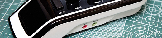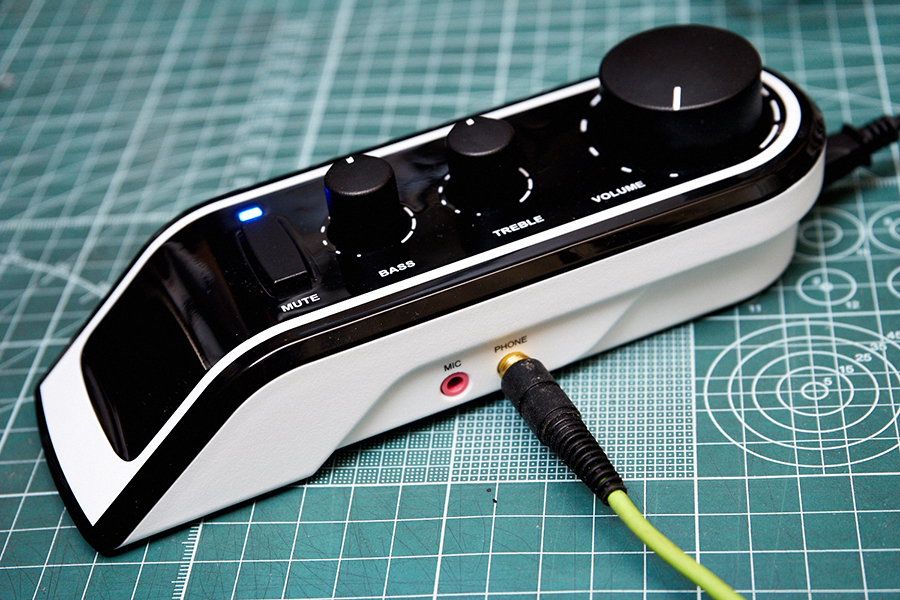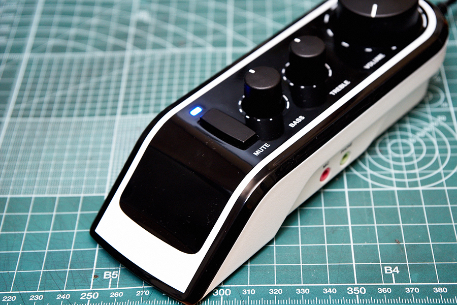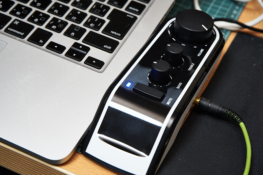 さて、外観を見ると、直径約37mmのボリュームコントローラーが目立つ。TREBLEとBASSのイコライザーコントローラーも備えているため、好みに応じて音質も変更できる。入出力は側面。3.5mmヘッドフォン出力/マイク入力があり、リスニングだけでなく、ボイスチャット用の入力機器としても使用可能だ。本製品にはMUTEボタンもあり、これはマイク入力のみに適用されるため、Skypeやゲームプレイ時のボイスチャットだけでなく、実況配信系にも役立つ使用だといえる。