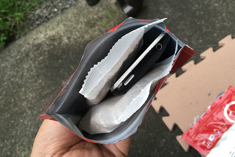 | DN-11552の同梱物は、シリカゲルとモレキュラーシーブ混合乾燥パック×2と、なぜか画面クリーナー。おそらく、タオルの代わりだと思われる | というわけで水没。iPhone 3GSとOptimus chat L-04Cを試験対象とした |