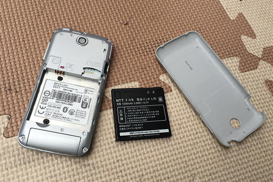 | 仕方ないので、Optimus chat L-04Cをもう1度水没させる。写真は突然のリブートをしたところ | バッテリーを取り外せる機器の場合は、写真のようになるべく分解した状態にする |