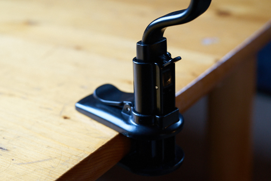 またクランプが付属しており、机の天板に挟んでスマホ専用アーム的な使い方にも対応する。このクランプは着脱式なので、アームとホルダーだけが必要である場合、ロックを外すだけで着脱できるという使い勝手の良さも光る。