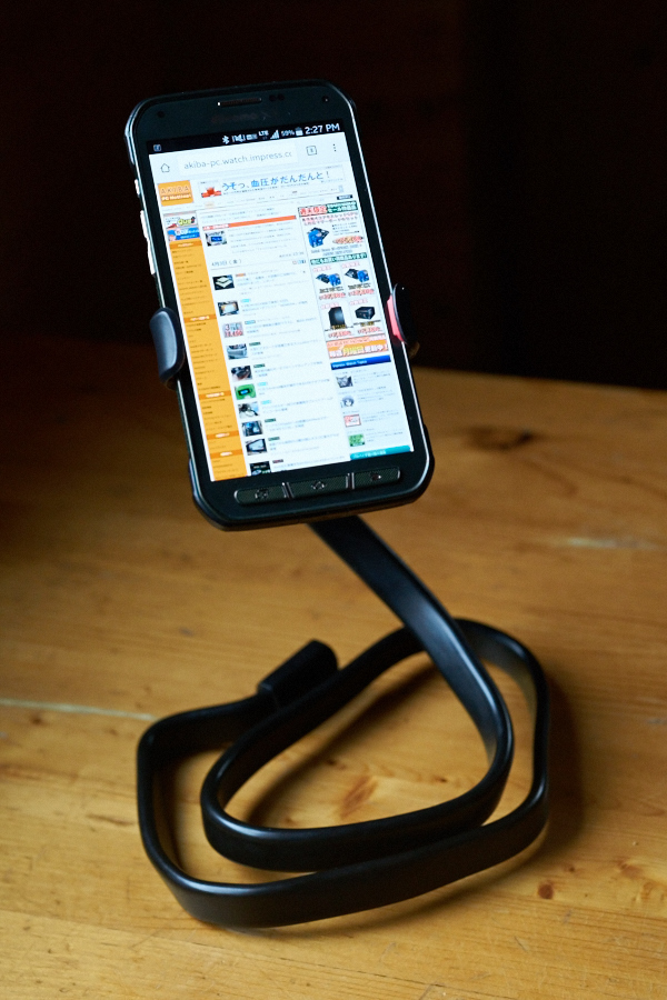 また長く伸ばしたとき、スマホの重さに負けてしまったら、アーム中腹部でS字を作ると安定するなど、使い込むほど小便利なところが見えてくるというのも楽しい。もちろん、腕だけでなく、柱に巻き付けてもいいし、何かの製品と組み合わせるのもいいと、このあたりはいつもの上海問屋製品的な部分だ。