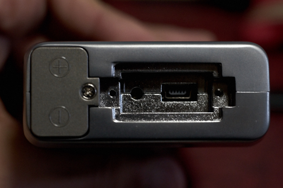 | 底部にある登録ボタンカバーを外すと、miniUSB端子と登録ボタンを確認できる | 電源は単4形乾電池×2。1日10回程度の使用だった場合、約10ヶ月動作する。また登録されている指紋は、フラッシュメモリに保存されているので、電池交換時などに再登録の必要はない |