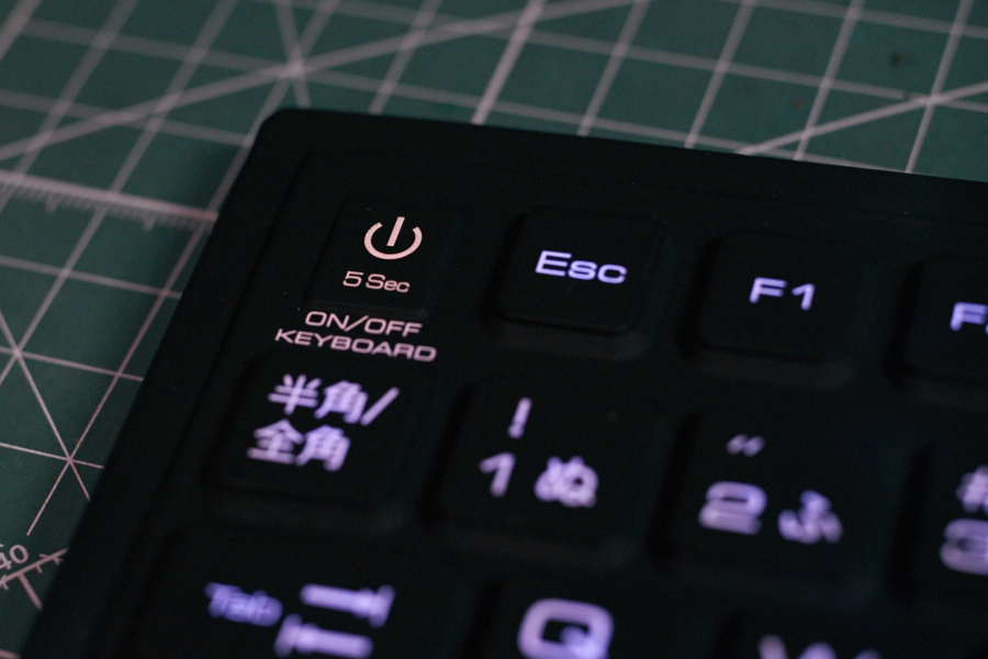| PrintscreenキーやScroll Lockキーも7列目にある。またScroll Lockキーの下にある白い丸はキーボードの電源ランプ | バックライトの輝度は4段階に調節可能 |