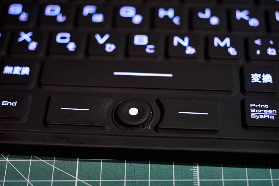 7列目にあるポイントティングデバイスについては、ちょうどいい位置にあるため、ノートPCのように親指でマウスカーソルを操作しやすい。また、その左右にあるクリックキーも十分なサイズが確保されている。
