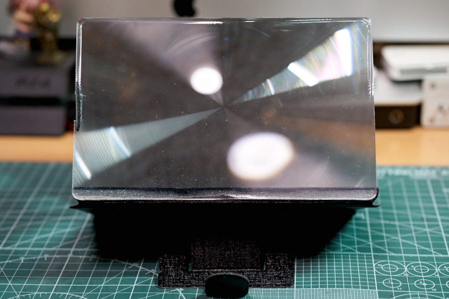 本体を開くと、フレネルレンズがある。これでスマホの画面を拡大するわけだ。また、固定用アームやある程度の角度変更に対応する折りたたみ式スタンドもあるため、設置時の自由度は高めだ。設置時で気になりそうなのは、奥行き。開いた状態で約130mmになるため、自宅であればスペースの確保は楽だと思うが、出先においては環境を選ぶ可能性が高い。