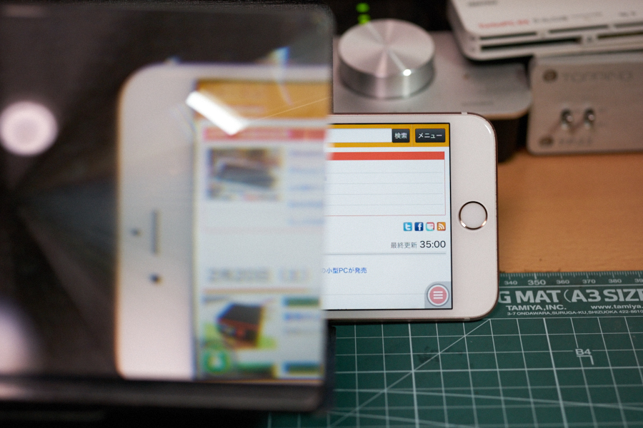 さて。テストとしては、5.5インチのiPhone 6s Plusを置いてみた。上記では幅120mmまでと記述しているが、拡大率からすると、6インチまでが全画面を参照できるくらいになるだろうか。iPhone 6s Plusの場合だと、微妙にズレてしまうなど、表示上の問題点がある。もちろん、見る角度によって変化する部分ではあるので、設置環境に依存する。また、部材が少し柔らかいため、フレネルレンズに対して水平になりにくく、そういった部分が気になる場合は「拡大鏡付きスマホスタンド DN-13158 (※)」をオススメする。あくまで本製品はモバイル重視のバージョンだ。