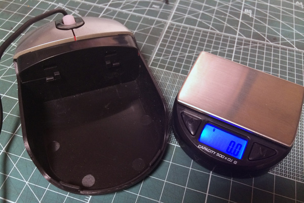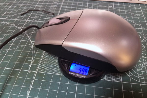 | デジタルスケールとしてはごくごく普通の性能 | 独立して動くため、マウス本体の重量の計測もできた | 写真のようにデジタルスケールを取り出したあとには、大きな空間ができる |