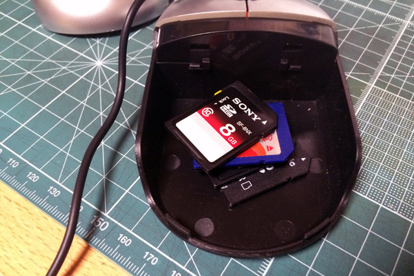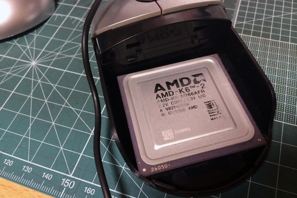 | SDカードを入れてみたところ。カチャカチャうるさいのでクッションは必須 | すでに使わなくなったがお気に入りのCPUを格納する場所としてなかなかよかった |