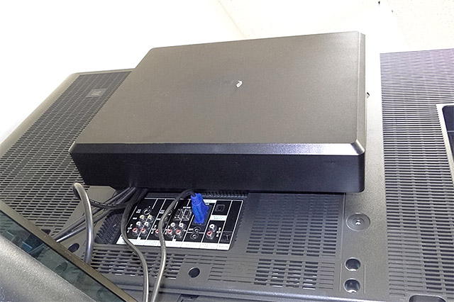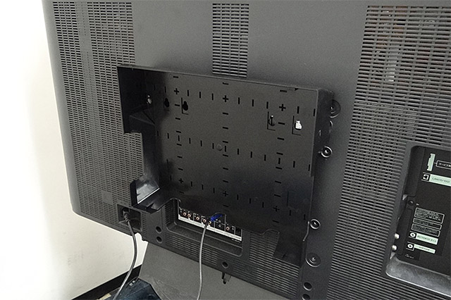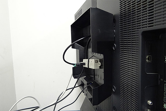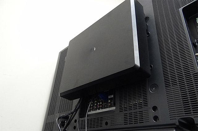 | 今回は46インチの地デジパネルでチェックしてみた | 本体のフタを外した状態で取り付けをしてVESAに合わせてネジ止め | 電源タップを取り付けた状態。電源タップの向きは、プラグ挿入口を天板か底板側に向けておくと干渉しにくい |
