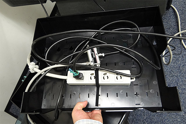 内部を見てみよう。内部は付属のベルトを通すスリットが規則的に用意されており、付属のベルトをカットしながら、ケーブルや電源タップを設置していくことなる。最初にセットするのは電源タップがオススメ。使い勝手を考えると、ほぼ中央に固定しておくと都合がいいだろうか。「ケーブル収納オーガナイザー DN-82360」のフタ自体は開閉させやすいため、頻繁にケーブル差し替えがある人も安心だが、それすら煩わしい場合は、本体内でケーブルを取り回しし、電源タップ部分を近くに出しておくのもアリだ。