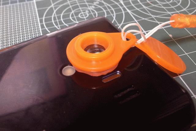 仕組みとしてはすべてのスマホに対応しているが、カメラ周辺が盛り上がっているタイプや、大型レンズを搭載した機種は、撮影時にレンズの端っこが写り込む可能性がある。手元の機種で試した限りでは、iPhone 4S/5のレンズ(iPhone 5のレンズ部の直径は約5.5mm)が前提になっていると思われ、AQUOS PHONE EX SH-04E(直径約8mm)では四隅にケラレのような具合で本製品が写り込んでしまった。といっても、クロップしてしまえば問題はないので、気持ち気をつけるくらいでいいだろう。