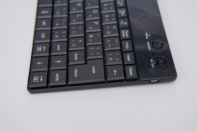 多くの小型でワイヤレスなキーボードは小さくするためであったり、デザイン性を優先したりで、何かしら変則サイズのキーが存在しているのだが、DN-84457は幅238mmを最大限に活用し、キーピッチ約16mmを実現している。