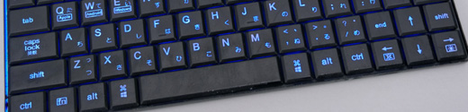 | バックライトも搭載。キーレイアウトは写真の通り、HomeキーとEndキーの配置が独特なものになっている。スペースの幅が長く確保されいてる点も見逃せない | 本体裏面の四隅にはゴム足が用意されている。厚み10mmでたわみやすい印象を受けるが、ボディは金属製で使用中にたわんでいる感覚はなかった |