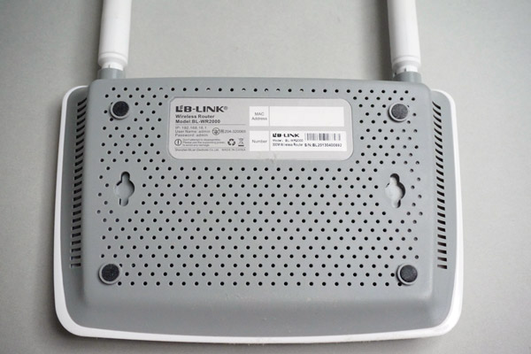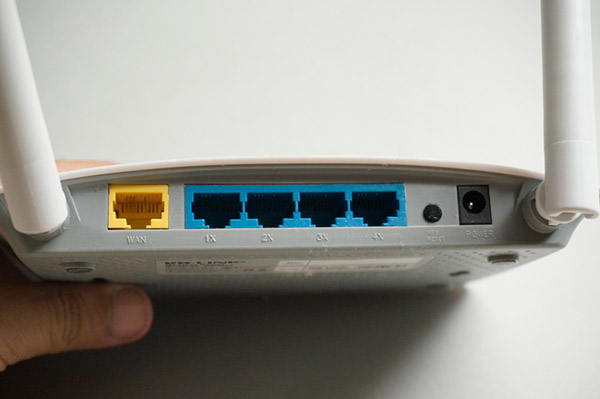 | 本体後部にはWAN×1、LAN×4、WPS・RESETスイッチがある | 底面には壁掛け用のネジ穴と冷却用のスリットがある。中心間隔は11.3cmなのでVESAにマウントは不可。軽量かつアンテナアリなのでモニター裏との相性がよさそうだったのだが |
