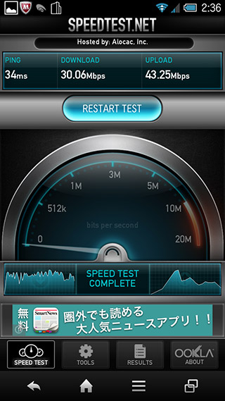 | 本体前面には接続状況などを示すLEDが用意されている | ACアダプターは、他社製品と比べるとだいぶ小型 | Speedtestの計測結果。浴室から計測してみたが、電波強度は非常に強いままだった |