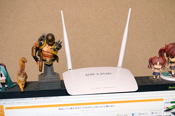 今回のアイテムは上海問屋発の無線LANルーター「IEEE 802.11n対応 無線LANルーターDN-84478」。特長は大きく突出した2本のアンテナで、他社製品よりも遮蔽物に対して強く、電波強度が低下しにくいという。