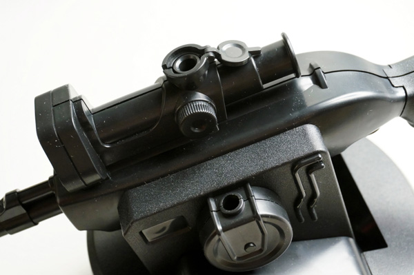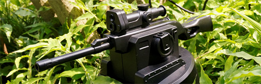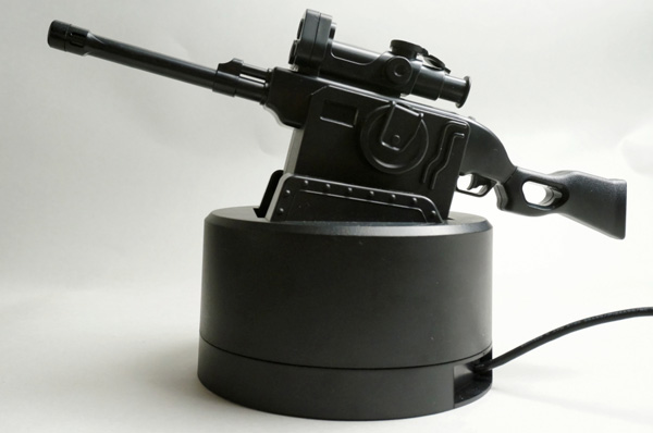 | ライフルに銃座がくっついたようなデザイン | 仰俯角は35°まで。リモート時の駆動もスムーズだ | こちらは俯角いっぱいにしたところ |